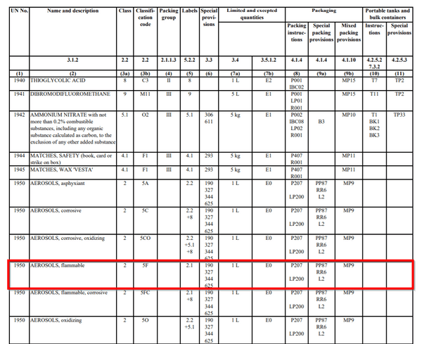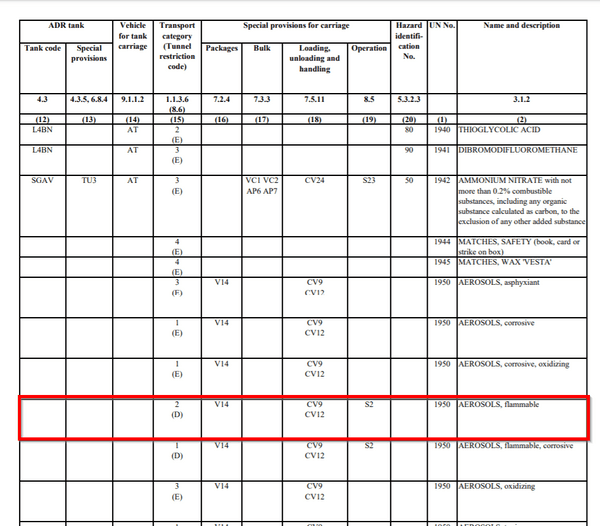 Companies are able to make use of this exemption option in section 1.1.3.6, which we will now look at in more detail. For UN No 1950, column 15 of the ADR table must be consulted in order to determine the transport category.