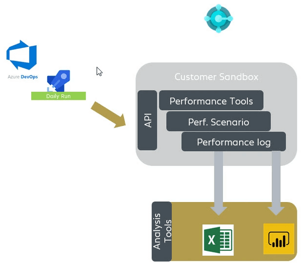Le lancement des tests de performance sur une sandbox Business Central peut être facilement automatisé avec un pipeline Azure Devops. Voici le schéma de principe :