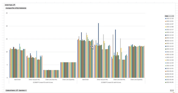 Dans cet exemple, on peut voir des augmentations des volumes de requêtes SQL sur certains scénarios qui ont nécessité des ajustements.