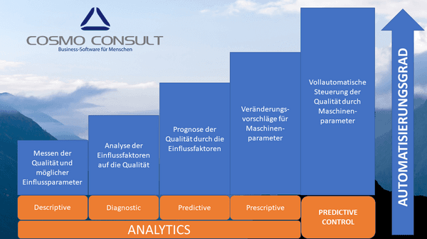 - Die fünfte Stufe ist dann die vollständige Automatisierung: Aus einem System, das Handlungsanweisungen liefert, wird ein System, welches automatisch für optimale Qualität sorgt und die Produktion stabil hält (Predictive Control – Man muss nichts mehr tun).
