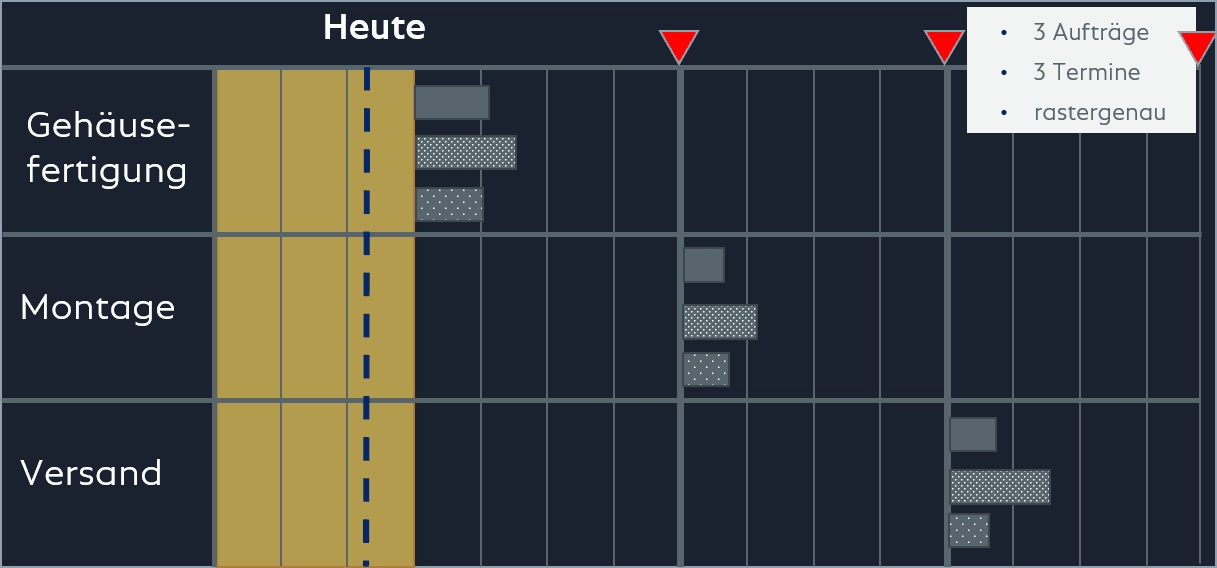 Der gemeinsame Takt mehrerer Teams entlang der Wertschöpfungskette, Konstruktion und der verlängerten Werkbank sorgt dafür, dass die gesamte Produktion synchron und im Fluss verläuft. Die Grobplanung in Takten erlaubt zuverlässige Terminaussagen sowie eine kapazitäts- und materialgeprüfte Lieferterminermittlung. Sie verhindert gleichzeitig unrealistische Planungen. Anhand von Simulationen erkennen Planer*innen bereits im Vorfeld der Auftragsplanung potenzielle Engpässe und Unterauslastungen.