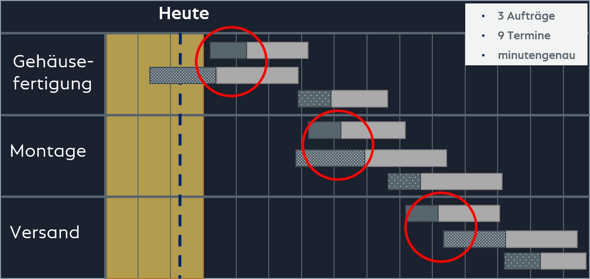 Klassische Planungssysteme basieren auf einer deterministischen, minutengenauen Feinplanung und unterbinden jegliche Eigenverantwortung während der Ausführung. Der Pflegeaufwand ist aufgrund der umfangreichen Datenmengen extrem hoch, während die Qualität der Plandaten oft sehr unzureichend ist. In der Einzelfertigung sind detaillierte Planungen häufig gar nicht möglich. Die Folgen sind minutengenaue Termine, mangelnde Akzeptanz, Schattensysteme und Schuldzuweisungen. Mit anderen Worten ist die Planung schuld, wenn Aufträge nicht pünktlich fertig werden.