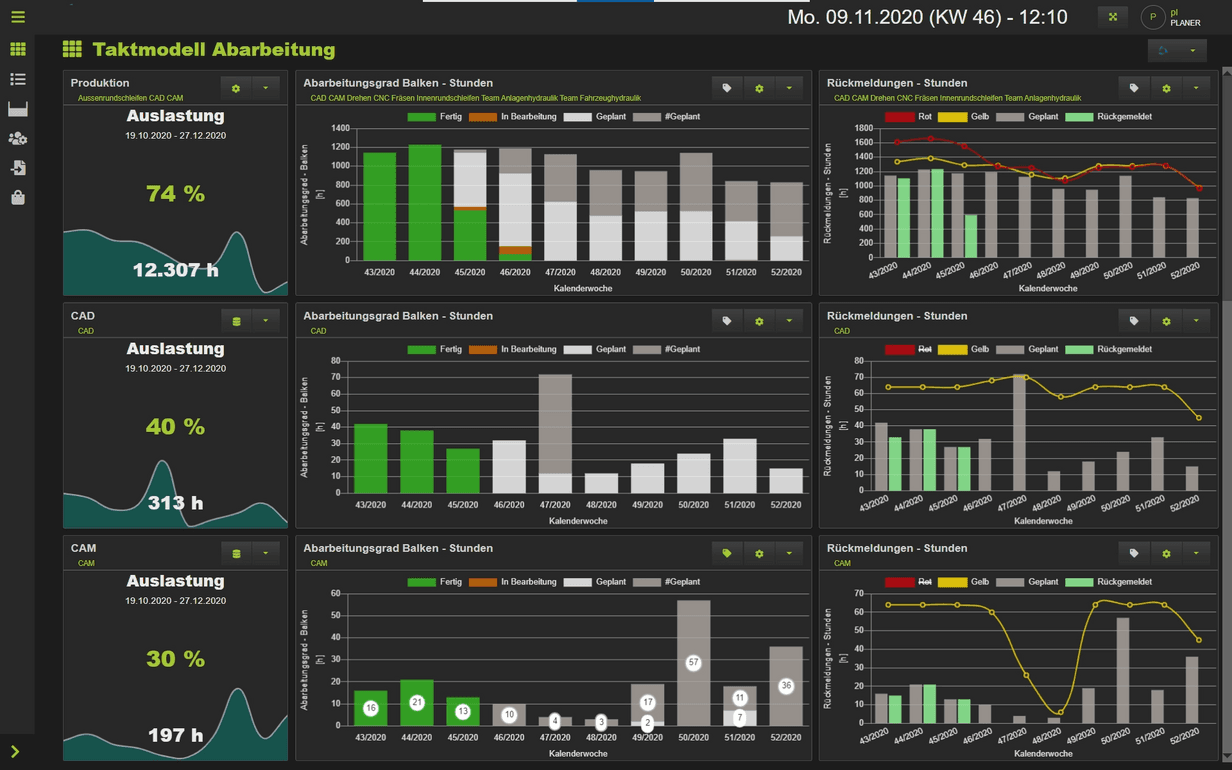 Das Konzept, in Takten zu planen, schafft Flexibilität und einen besseren Überblick über die aktuelle Kapazitätsauslastung. Mit der taktorientierten Planung können Ihre Mitarbeiter*innen Bearbeitungszeiten, Arbeitspläne und Bedarfsmengen variabel planen, berechnen und erstellen. Die Produktion im Takt unterstützt Sie bestmöglich. Visuelles Arbeiten und eine einfache grafische Planung sorgen zusätzlich für die notwendige Akzeptanz bei den Mitarbeiter*innen. Das Zusammenspiel von Planung und Ausführung wird durch die zentrale Grobplanung, die dezentrale Feinplanung und die zentrale Synchronisation der Termine maximal optimiert.