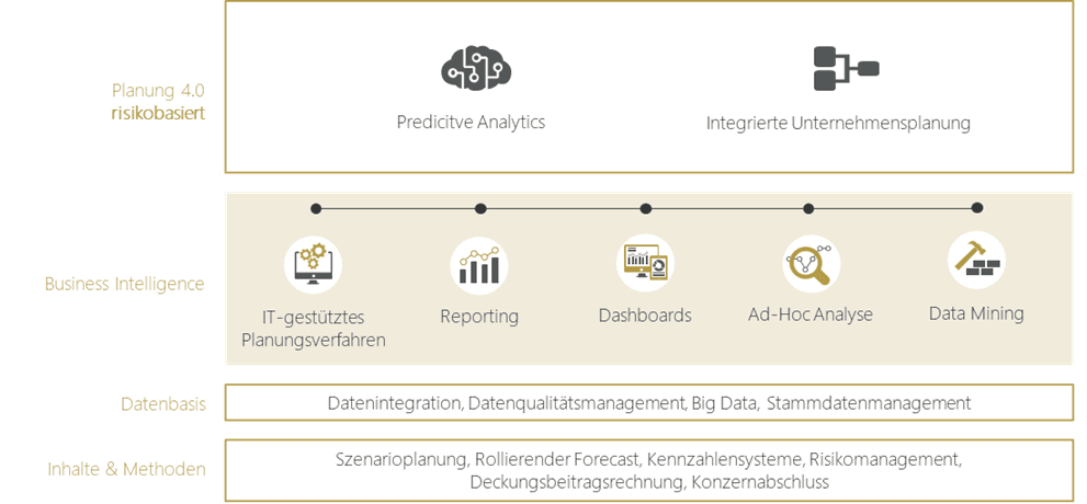 Eine integrierte Lösung für die Planung erfordert demnach eine enge Verbindung aller Systeme: alle planungsrelevanten Inhalte, wie Preis-, Mengen-, Absatz- und Kostenstellenplanung -müssen, unabhängig von ihrem physischen Standort, zusammenlaufen. Es müssen sich sämtliche Anpassungen der einzelnen Teilplanungen direkt in den darauffolgenden Planungsschritten widerspiegeln. Die Datenbasis muss jederzeit sowohl für klassische Soll-Ist-Vergleiche als auch für die Anwendung von Predictive Analytics vollständig und von einer hinreichenden Qualität sein.
