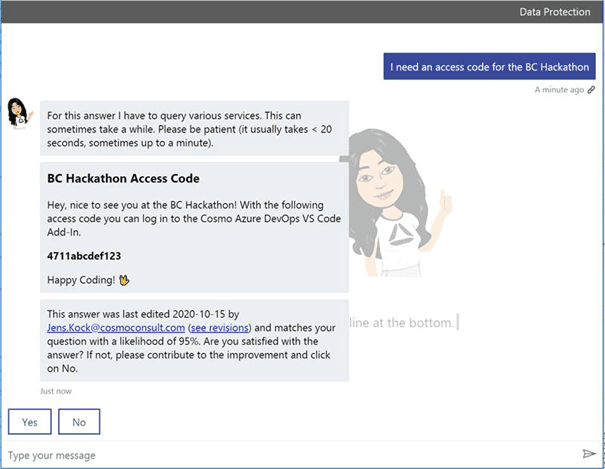 Der Zugang zur Plattform wird standesgemäß von einer Künstlichen Intelligenz bewacht. Sie hört auf den Namen COSMA und ist ein von COSMO CONSULT entwickelter charmanter Chatbot, der im Dialog die Anmeldung zum Hackathon prüft und automatisch den Zugangscode vergibt.