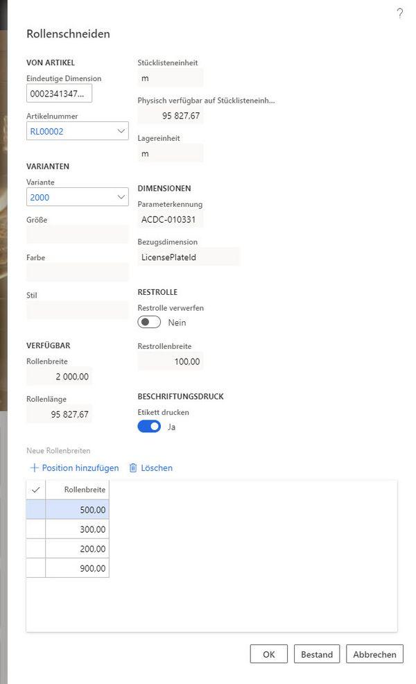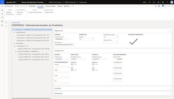 Ist das Schneiden von Rohmaterial mit einer weiteren Fertigung gekoppelt, also mit einem bestimmten Los, so kann dies entweder als einfacher Arbeitsgang oder als eigene, referenzierte Vorproduktion eingefügt werden. Das COSMO Produktcockpit bietet hier die Möglichkeit das Ganze einfach abzubilden und die Vorteile des Dynamics 365 for Finance and Supply Chain Management zu nutzen. Die geschnittenen Rollenformate können hierbei entweder wieder als Rohmaterial, oder als Halbfertigware (HF) bzw. Work In Progress (WIP) weitergeführt werden.