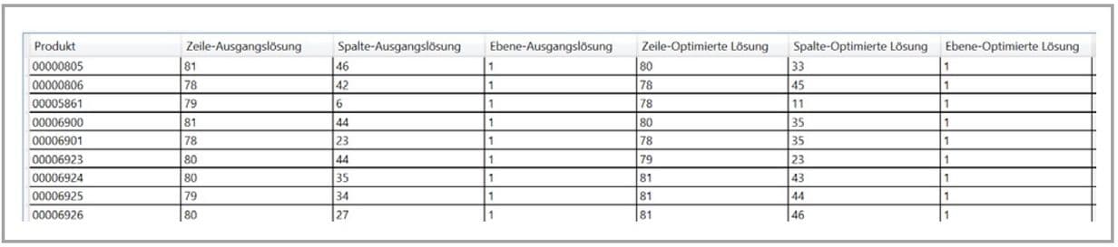 Die berechnete Lösung für eine optimierte Artikelposition enthält einen entsprechenden Umplatzierungsvorschlag, der aus Artikelnummer, Ausgangs- und Zielposition besteht (Abbildung unten). KundInnen können das Warensortiment je nach Bedarf leichter umlagern. Die Lösung basiert auf einem Webservice und lässt sich an verschiedenen Standorten steuern und zentral verwalten. Dank kurzer Rechenzeiten von nur wenigen Minuten können mehrere Szenarien parallel ausgewertet und verglichen werden.