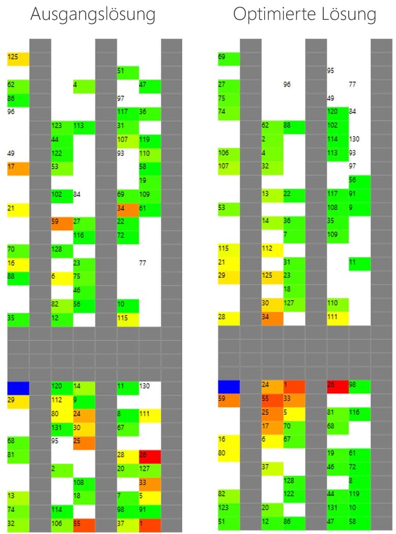 Abbildung Optimierung der Kommissionierzonen zeigt die Ausgangssituation (links) im Vergleich zur optimierten Lösung (rechts). Es ist eindeutig zu erkennen, dass die Clusterung nicht streng zur Mitte tendiert. Es entstehen Teil-Clusterungen, weil einige Artikelkombinationen häufiger kombiniert werden als andere. Je öfter gewisse Artikel be- bzw. entladen werden, desto näher befinden sie sich am Ausgangspunkt in der Kommissionierzone.
