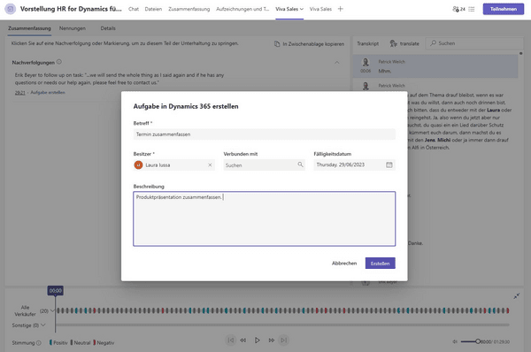 Auch in Microsoft Teams ist Viva Sales integriert und ermöglicht das Aufzeichnen und die KI-basierte Auswertung von Online-Meetings und Teams-Telefonaten. So kann der Vertriebsmitarbeiter jederzeit, das Meeting erneut abrufen.