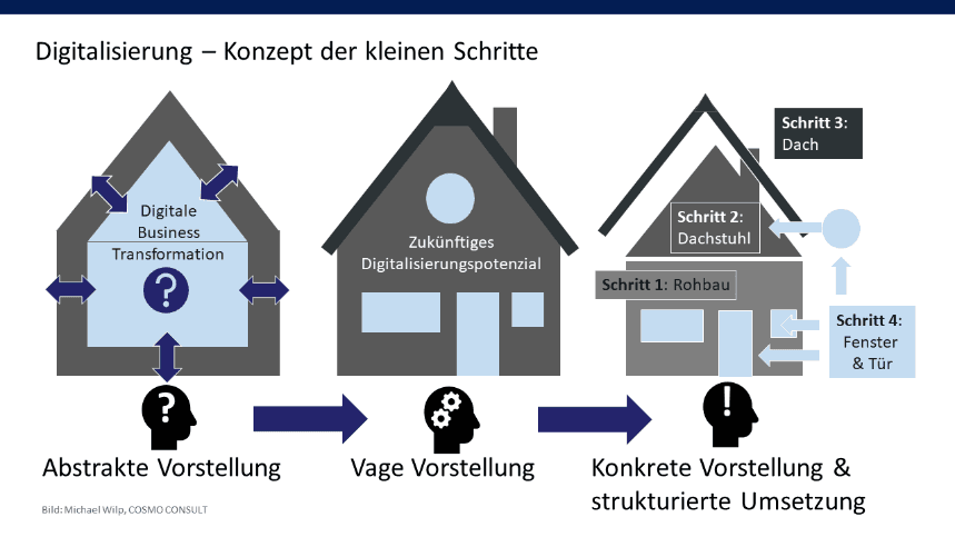 Welche Cloud-Variante passt am besten zu Ihrem Unternehmen? Um das herauszufinden, brauchen Sie ein gutes Konzept. Das Motto lautet dabei: think big – start small, denn eine der besten Seiten der Cloud ist ihre Flexibilität. Es ist gar nicht nötig, Ihre gesamte IT-Infrastruktur auf einmal umzukrempeln. Gehen Sie es ruhig an und entscheiden Sie sich für ein Konzept der kleinen Schritte. Auf diese Weise behalten Sie die Kontrolle über Tempo und Prioritäten – und kommen trotzdem zu sinnvollen Ergebnissen. Stellen Sie sich die folgenden Fragen: