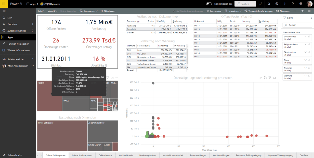 Business Intelligence (BI)-Produkte wie Microsoft Power BI liefern Ihnen wertvolle Informationen. So sorgt ein grafisches Dashboard zu den offenen Posten auf Kunden- und Lieferantenseite sorgt für die nötige Transparenz, um Höhe und Relevanz überfälliger Außenstände zu bewerten. Zusätzliche Details lassen sich per Mouse-over-Effekte oder einem Klick auf relevante Positionen abrufen. Nutzen Sie Analysefunktionen, um große Datenbestände nach Attributen wie Datum, Kunde, Region oder Lieferant zu analysieren und unterschiedliche Fragestellungen zu beantworten.