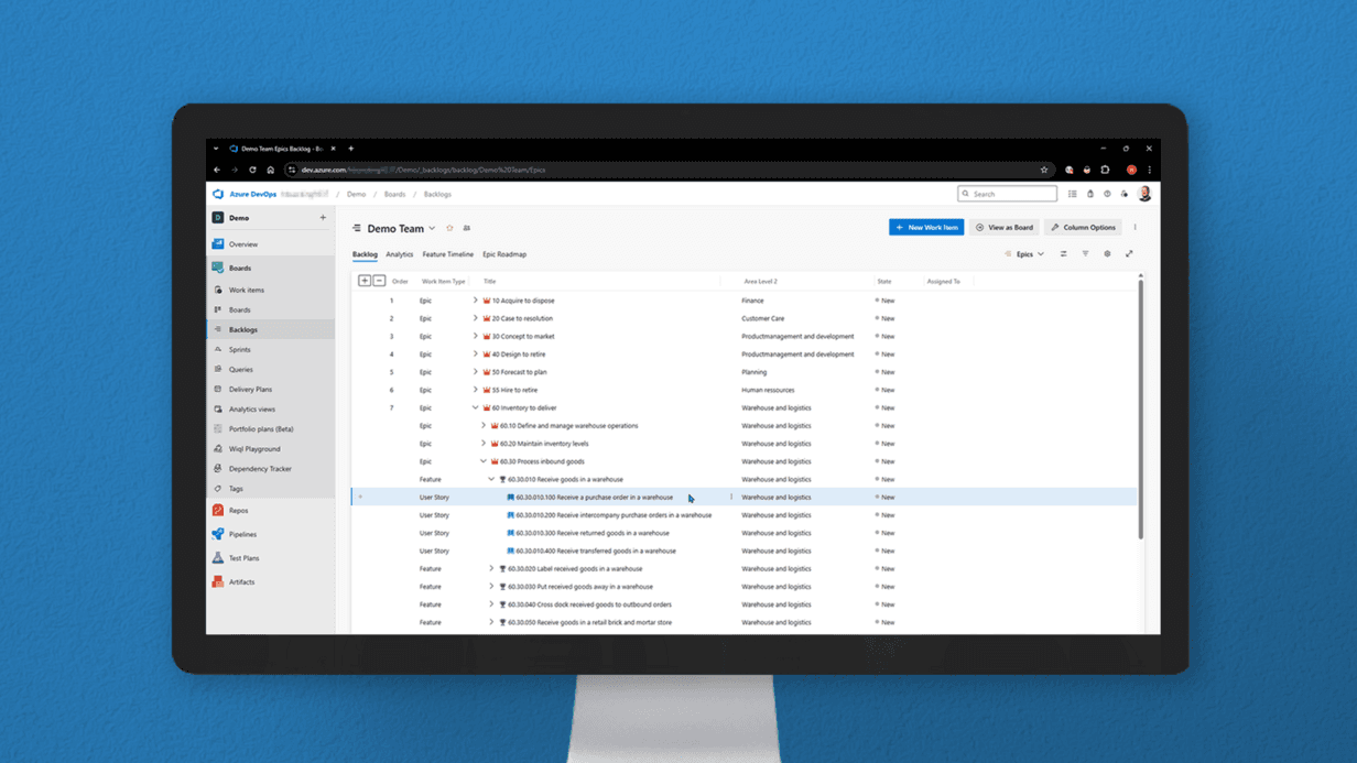 - können Sie Work Items wie Epics, User Stories und Tasks erstellen, verwalten und sinnvoll verknüpfen.