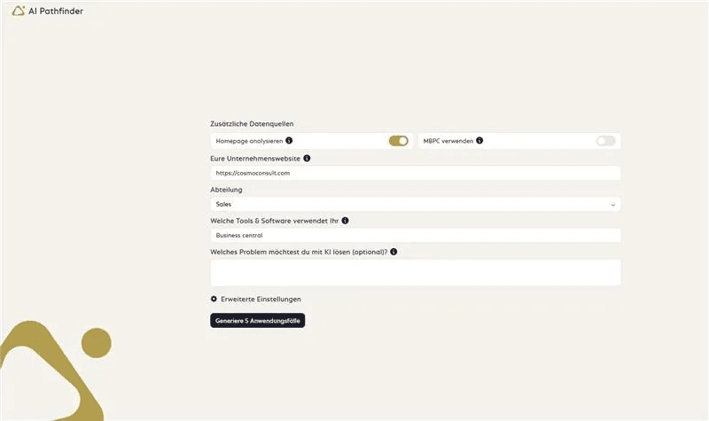 Simply enter your company URL, answer a few questions about your goal - and the Pathfinder identifies relevant use cases and generates appropriate recommendations for your personalized AI strategy.