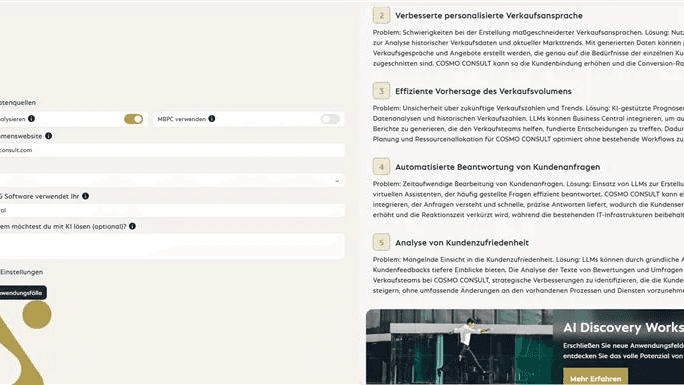Instead of laboriously searching for AI applications yourself or booking expensive workshops, the AI Pathfinder delivers automated results, results individually tailored to your company. The brilliant part: You also receive use cases suitable for everyday use that can be implemented with manageable effort.