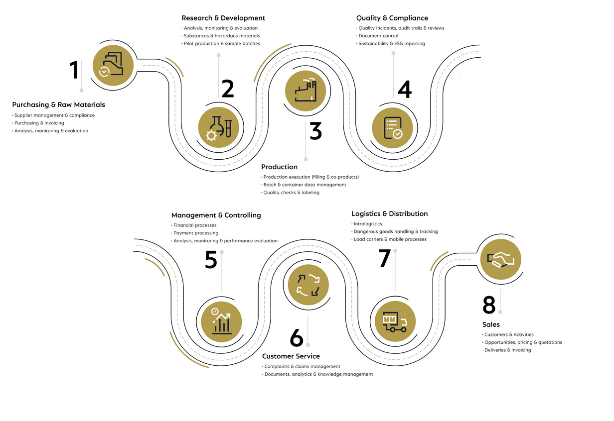 Consistent data flows: Our integrated solution combines ERP, laboratory information management system (LIMS), quality management and hazardous substance processes. Safety-relevant changes such as formulations, testing protocols, or safety data sheets instantly sync across teams: no gaps, no holdups, no version mix-ups.