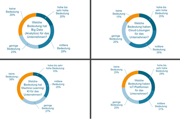 Viele dieser Themen sind heute eng mit der Cloud verknüpft. Dabei gibt es durchaus noch Vorbehalte: Zwar nimmt die grundsätzliche Skepsis gegenüber Cloud-Systemen ab – aber die Infrastruktur ist einfach noch nicht so weit. Außerdem sind praxisnahe Anwendungsbeispiele immer noch Mangelware. Auch hier liefert der IT-Report des VDMA Zahlen: Das Thema künstliche Intelligenz (KI) bzw. Machine Learning hat zum Beispiel für beachtliche 55 Prozent aller Unternehmen noch keine oder nur eine geringe Bedeutung. Bei Cloud, Big Data und IoT sieht es ähnlich aus.