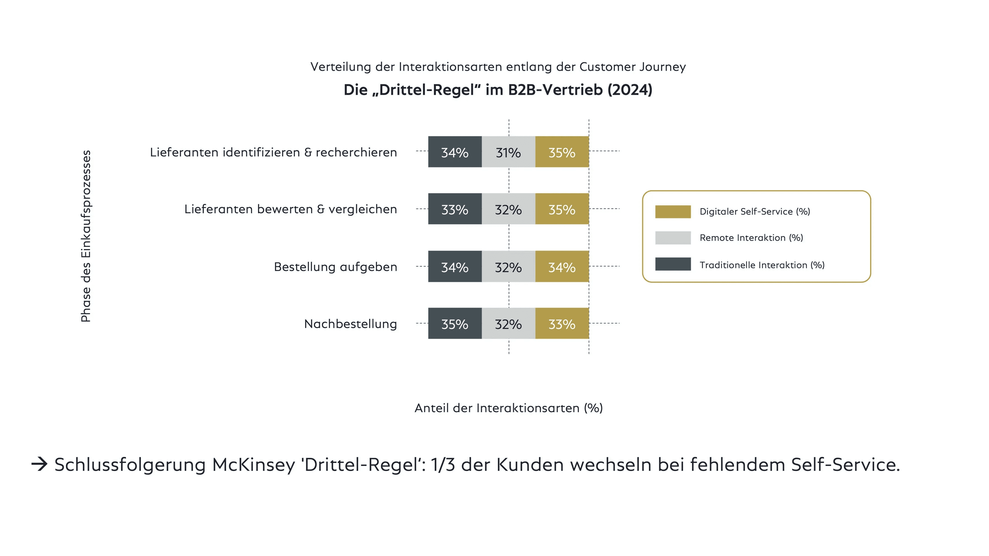 Eine aktuelle McKinsey-Studie zeigt: Die Erwartungen der B2B-Kunden haben sich grundlegend gewandelt. Ein Drittel bevorzugt inzwischen digitale Self -Services – also B2B Onlineshops, Kundenportale im B2B und smarte Tools zur Information und Bestellung. Mit anderen Worten: Ein fehlender Onlineshop kann bedeuten, langfristig ein Drittel der eigenen Kundschaft zu verlieren.