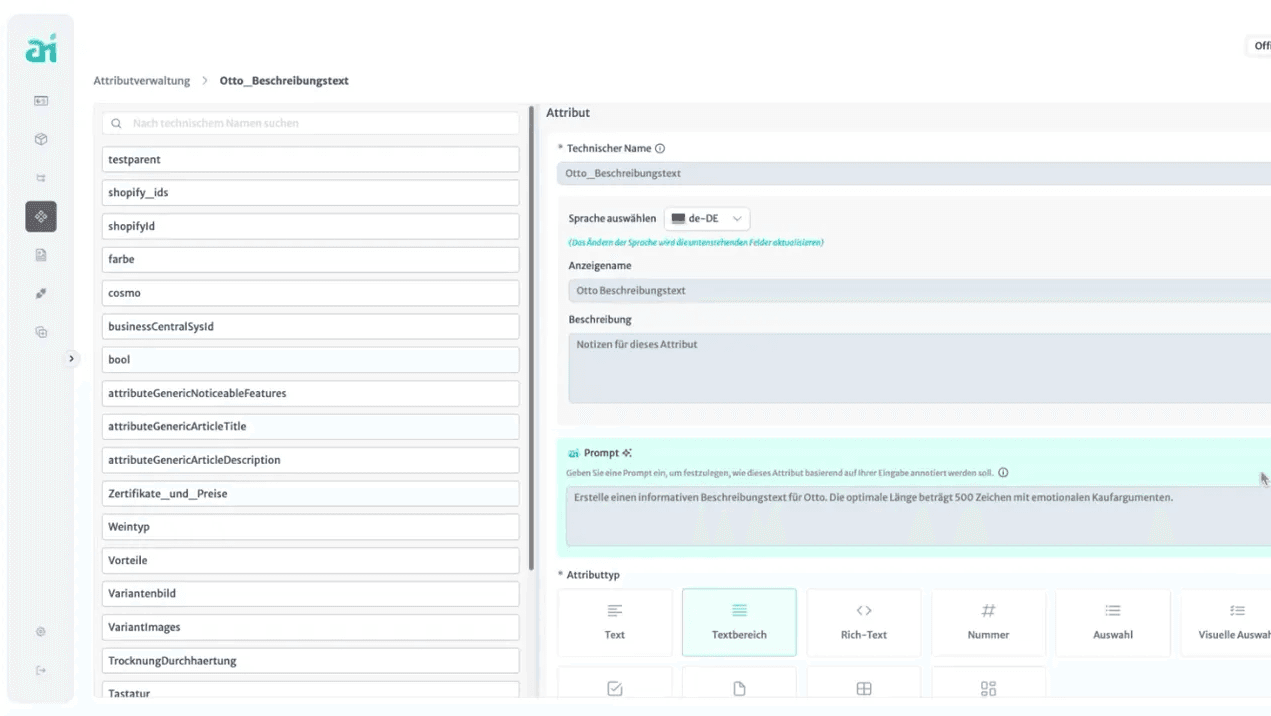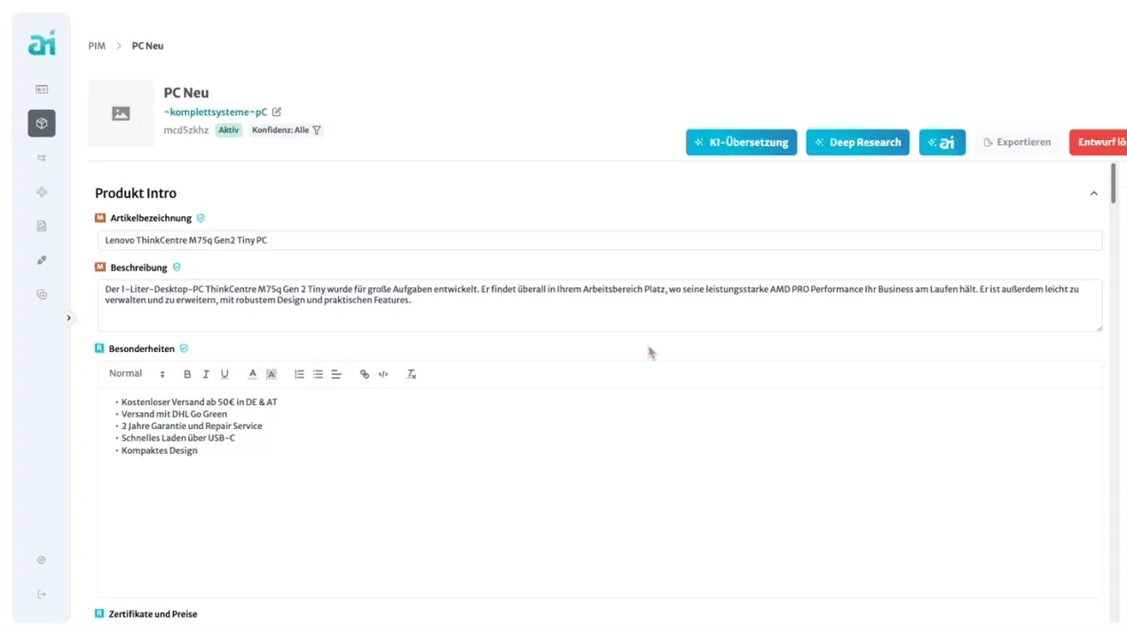 - Datenanreicherung mit KI: Automatische Textvorschläge, Attributzuordnung, Übersetzungen & SEO.