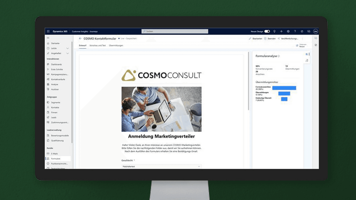 - Formulare: Gestaltung und Integration von Marketing- und Registrierungsformularen zur Erfassung von Lead-Daten und zur Verwaltung des Consent-Status in Dynamics 365. Schwerpunkte sind die Einbindung auf Webseiten und die automatisierte Datenverarbeitung.