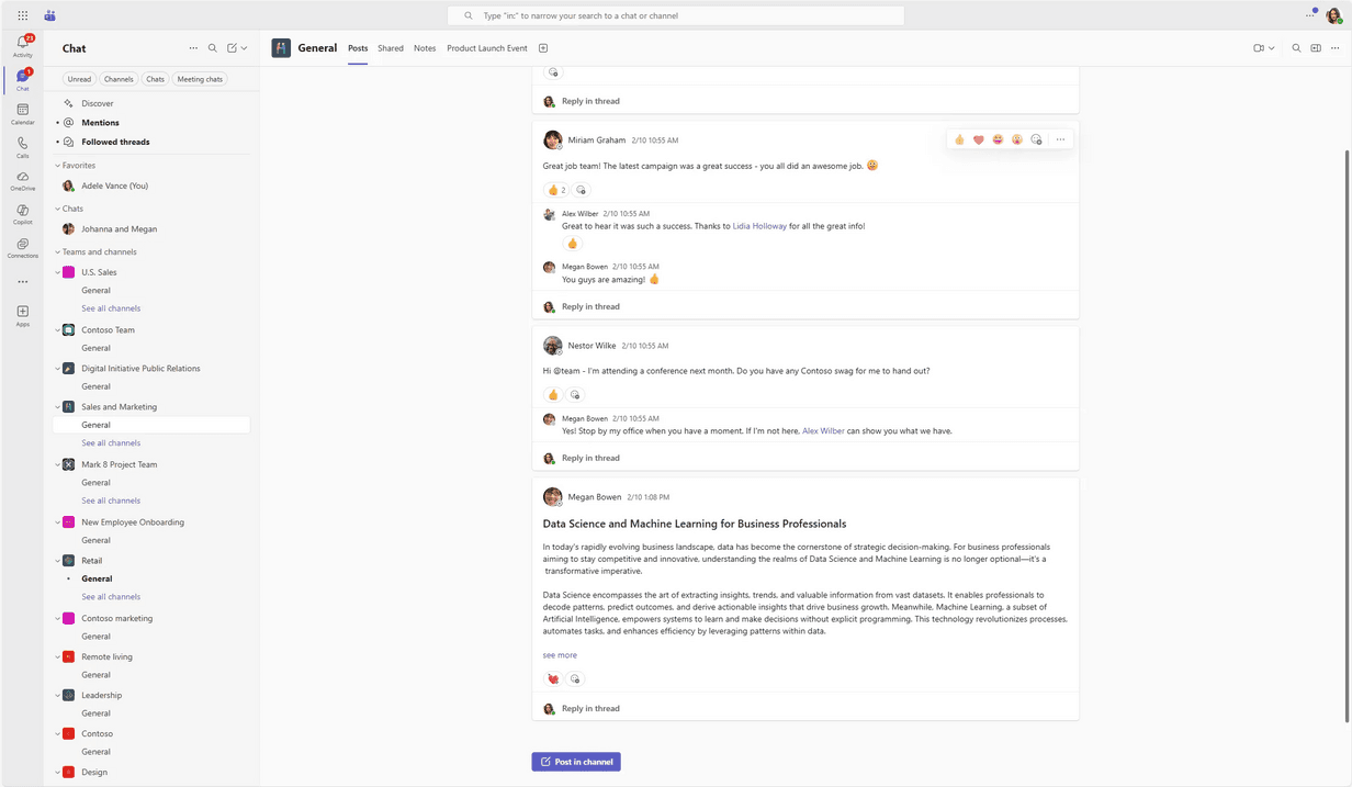 Chats, Kanäle, Meetings und Dateien laufen in Microsoft Teams zusammen. Strukturieren Sie ganz einfach Ihre Projekte, Abteilungen und Standorte, binden Sie nahtlos externe Partner ein und reduzieren Sie zugleich die E-Mail-Flut.