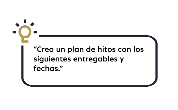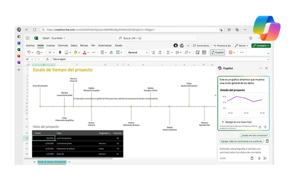 - En Excel, facilita la creación de cronogramas dinámicos, presupuestos actualizados y análisis de riesgos con instrucciones en lenguaje natural como:
