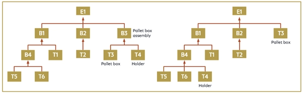 In vehicle construction, we have an assembly called “pallet box.” It consists of the support bracket, plus the actual box itself. To the construction department, these two parts constitute one logical unit – an assembly.