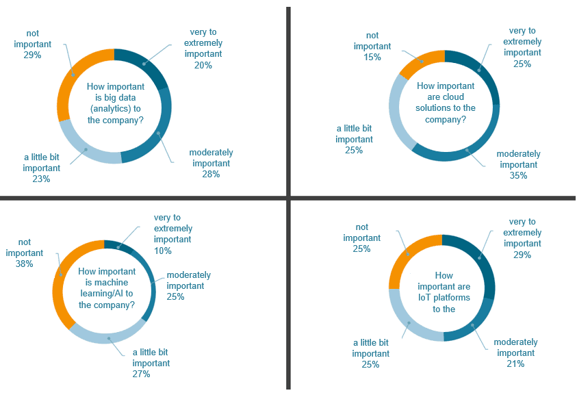 Many of these topics are currently associated with cloud technology, which is still being met with hesitation. The general skepticism about cloud systems is abating. Unfortunately, the infrastructure has not caught up, yet. What’s more, practical examples of application are still in short supply. The IT Report offers some insight into this question, too: The topic of artificial intelligence (AI) or machine learning, for example, is still rated as having little or no importance by a whopping 55% of businesses. The results paint a similar picture for cloud technology, big data and IoT.