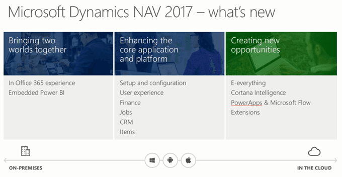 In general, the new and enhanced features of Microsoft Dynamics NAV 2017 are referred to three areas: the enhancement of core functions, the closer connection with mobile Office procedures and the user friendly adaptation to individual business needs. In addition to that the basic CRM features of Microsoft Dynamics NAV have been revised together with the possibility of easily integrating Microsoft Dynamics CRM with the help of a new assisted setup guide.