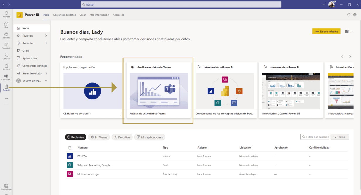 Como hemos mencionado, podemos analizar el uso de Teams desde Power BI. Para hacerlo, en la parte inferior del menú izquierdo de Teams, veremos unos puntos suspensivos. Al hacer clic, nos mostrará las aplicaciones que tenemos disponibles para ‘anclar’ en el menú de Teams y acceder a ellas directamente. Buscamos “Power BI” y, una vez seleccionado, añadirá el icono de Power BI en el menú y nos mostrará dentro de Microsoft Teams la pantalla de inicio de Power BI.