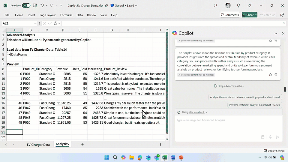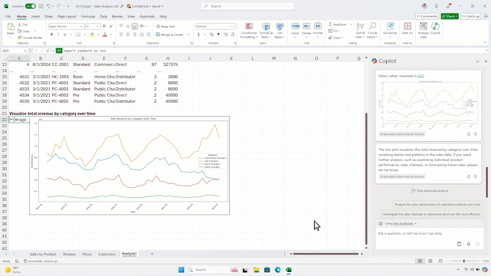 - Revise y colabore: Copilot crea una hoja de análisis donde puedes editar el código generado o actualizar los datos para refrescar los resultados