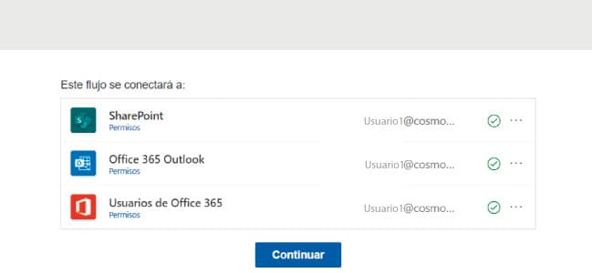 Esta plantilla creará el esquema del flujo directamente, así que lo primero que debemos hacer es validar si tenemos los permisos necesarios. En concreto, para crear el flujo automatizado, debemos tener acceso a SharePoint, Outlook y Notificaciones. En pantalla nos muestra el texto: “Este flujo se conectará a..” Y a continuación los servicios citados.