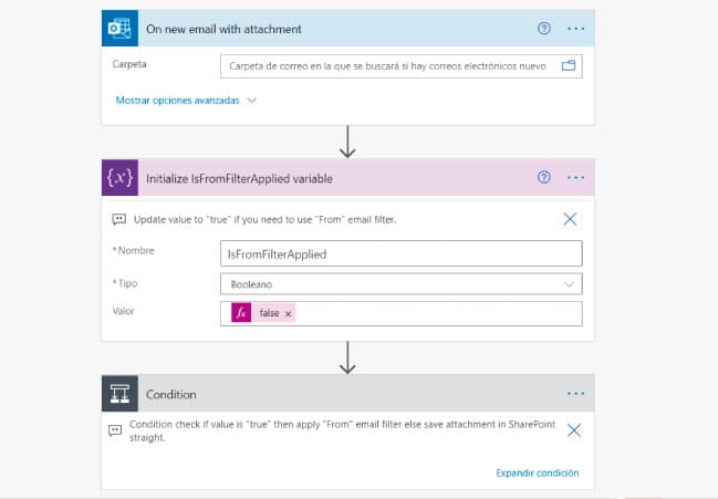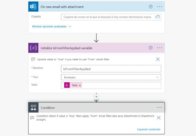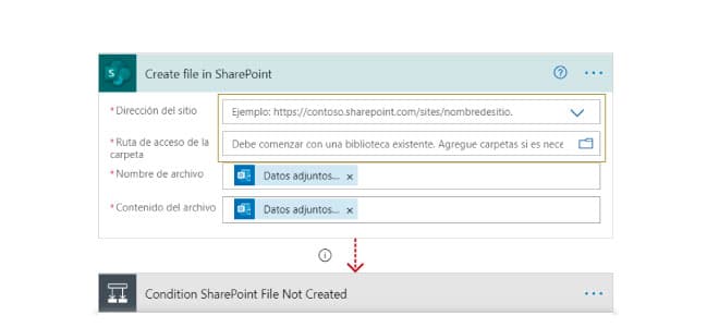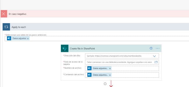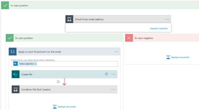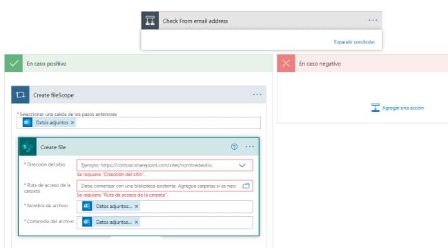 La condición que habíamos indicado era filtrar la dirección de e-mail del remitente. Si es correcto y debe procesarse, vamos a guardar los archivos adjuntos donde especificamos, dentro de la librería y sitio de SharePoint que vamos a usar.