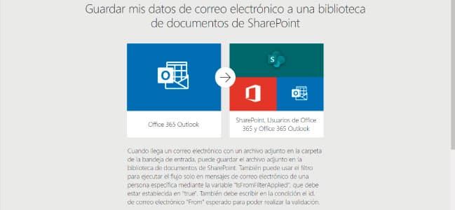 La descripción de la plantilla lo explica todo: “Cuando llega un correo electrónico con un archivo adjunto en la carpeta de la bandeja de entrada, puede guardar el archivo adjunto en la biblioteca de documentos de SharePoint”. Y eso es exactamente lo que vamos a ver.