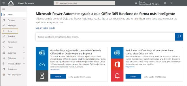 Veremos la pantalla de inicio de Power Automate, donde podemos clicar en el menú lateral “Crear”