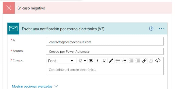 Nos desplazamos hacia abajo y vamos a especificar el resto de las condiciones. Todo lo que necesitamos en este caso es indicar que el flujo nos envíe un email si hay algún problema. Por ejemplo, si no puede guardar los archivos por cualquier motivo.