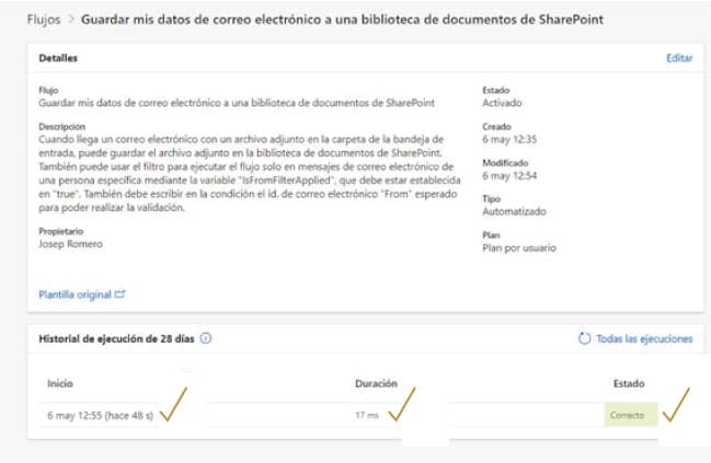 Una vez probado el flujo, en pantalla podremos ver un resumen de la automatización, indicando su nombre y descripción, su estado y otros datos de interés como la duración del flujo, propietario y plantilla utilizada, si se ha usado.