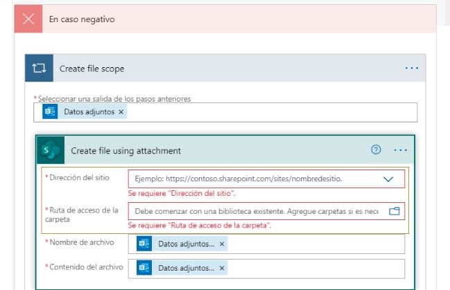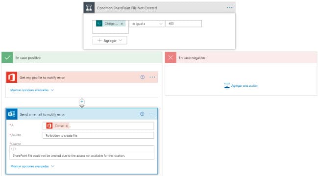 Con ello, si por alguna razón no puede crear el archivo o guardar el adjunto en la librería de Sharepoint, enviará un email al usuario. En este caso el código de error será el 403.