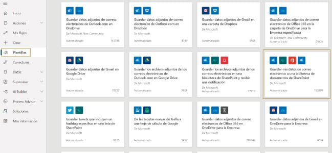 Lo que vamos a hacer a continuación es lo siguiente: como verás, en la sección “Comenzar desde una plantilla” existe una opción para e-mails, así que buscaremos y elegiremos la opción de la plantilla “Guardar mis adjuntos de mail en una librería de documentos SharePoint”.