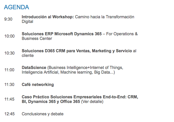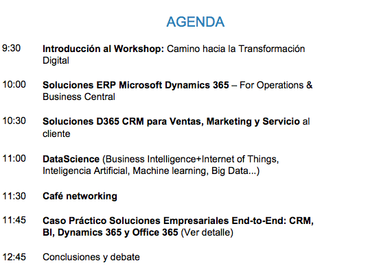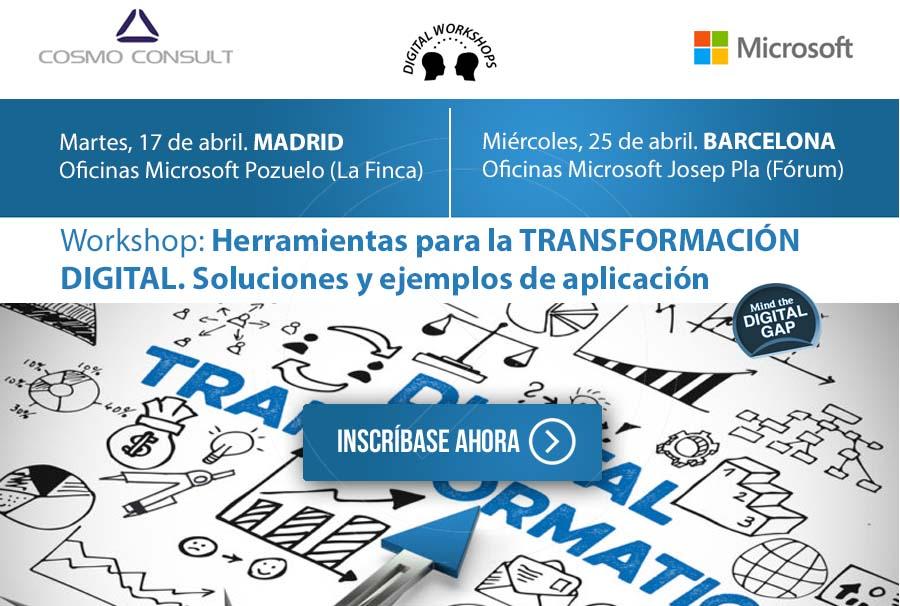 No le hablamos del futuro; la transformación digital está aquí y a unavelocidad que invita a no esperar más. En estos Workshops le presentamos escenarios reales para mostrarle cómo están abordando ya muchas empresas sus procesos e interacciones con clientes y proveedores de forma digital. Una transformación que está dando lugar a nuevas oportunidades y que no puede dejar pasar ni un día más.