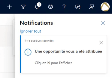 La notification apparait alors sous forme de carte, en haut à droite de l'interface CRM. Elle restera visible quelques secondes. Si jamais elle n’est pas consultée par l’utilisateur, une pastille restera néanmoins visible dans le bandeau supérieur du CRM jusqu’à ce qu’elle soit traitée.