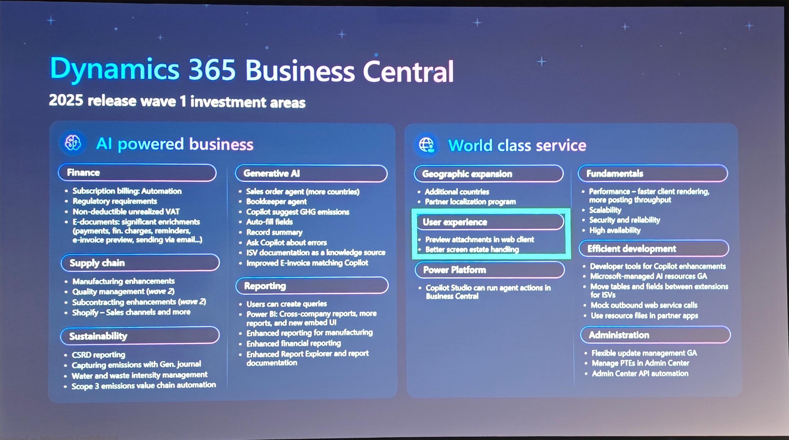 Intégration des services de Terrain. Le produit Microsoft Dynamics 365 Field Service est désormais intégré et connecté en natif avec Business Central. Cela permet le suivi et la gestion des interventions sur le terrain directement depuis Business Central. L'utilisation de l'IA pour optimiser l'affectation des ressources et améliorer la satisfaction client a également été mise en avant.