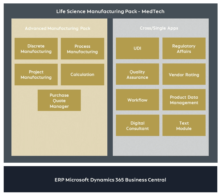 Dans le domaine des MedTech, l’ERP doit spécifiquement s’adapter aux besoins de ce secteur complexe et hautement réglementé. Pour répondre au besoin de l’industrie médicale, notre équipe R&D Life Science a développé une solution sectorielle, COSMO Life Science. Elle complète l’ERP Business Central avec des fonctionnalités métier :