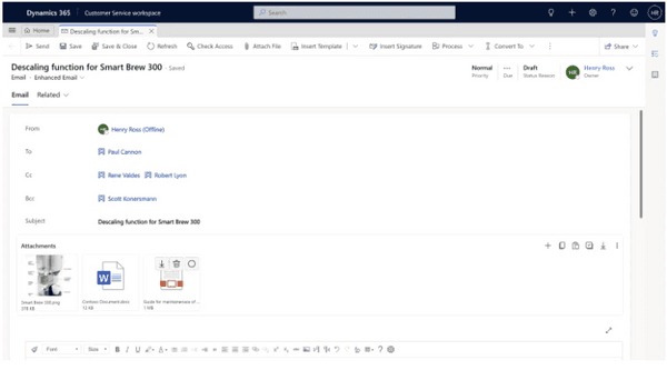 L’expérience améliorée des destinataires dans les courriers électroniques permet de configurer les adresses e-mail avec les noms des destinataires, de glisser-déplacer les destinataires entre les champs À, Cc et Cci, d’afficher leurs statuts de présence et les messages d’absence du bureau, et de résoudre en bloc les adresses e-mail en enregistrements Dynamics 365.