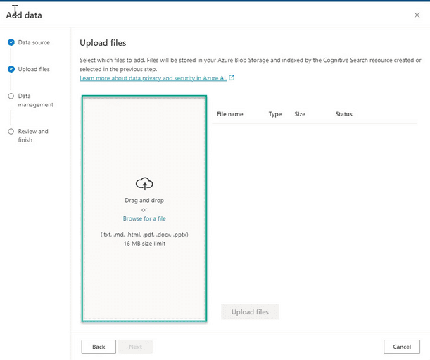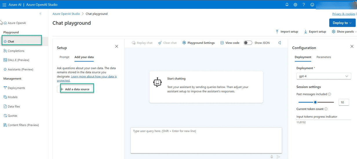 - Étape 3 : importer les données dans Azure Open AI Studio > ouvrir Azure Open AI Studio depuis votre ressource Azure AI hub > aller sur l’onglet Chat et cliquer sur “Add a data source”
