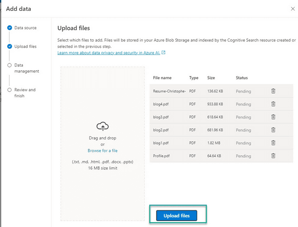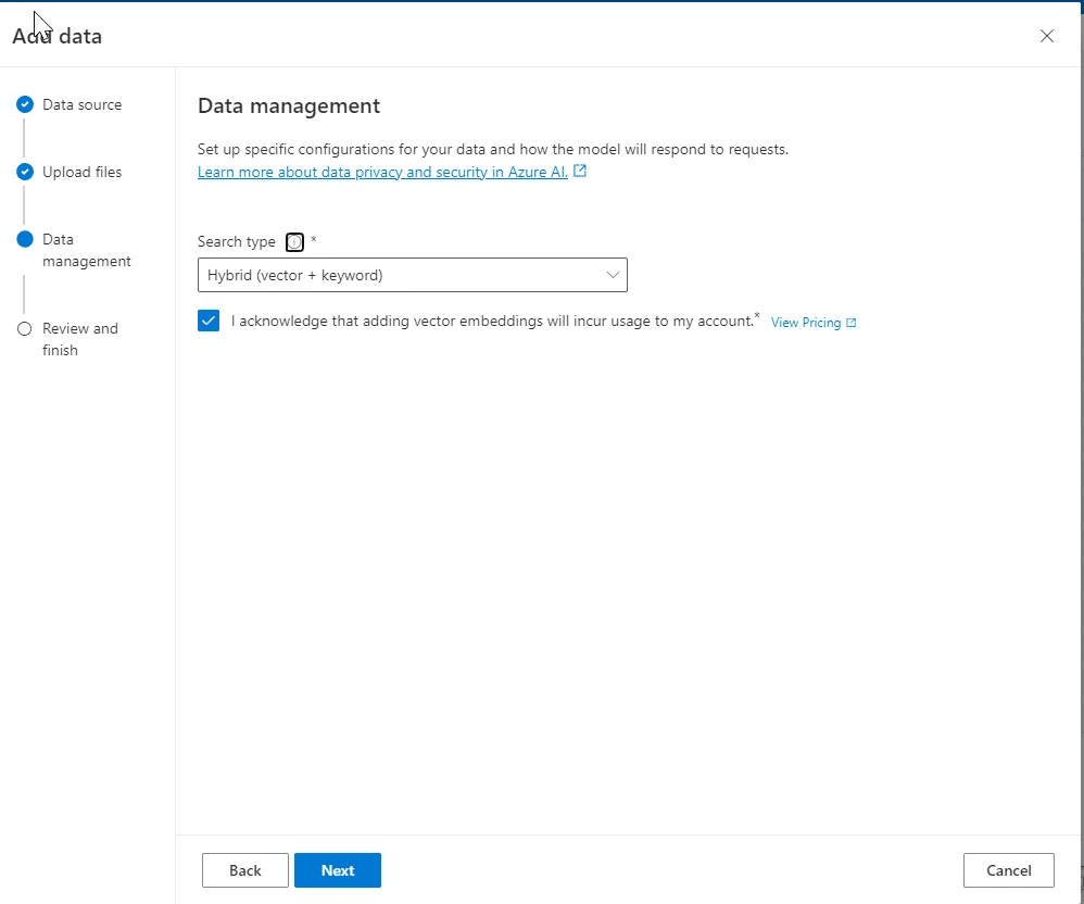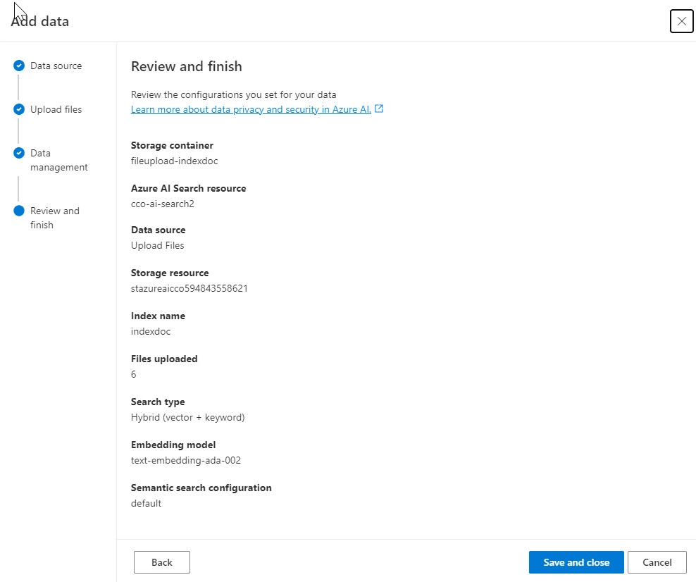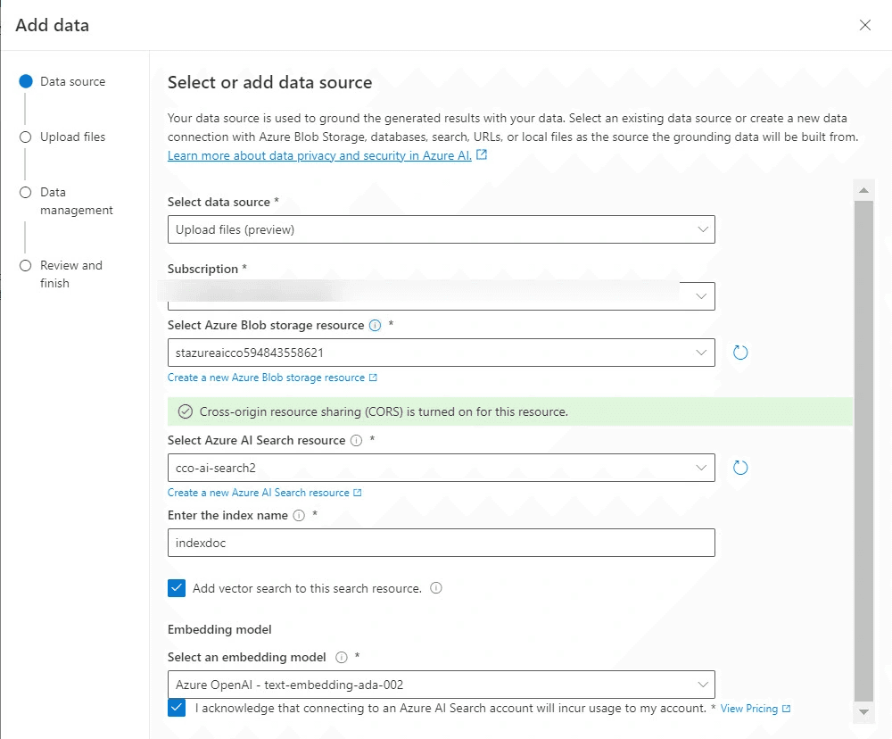 Sélectionner les options ci-dessous. Si vous ne l’avez pas déjà fait, il est possible de créer un Azure blob storage, ainsi que le service Azure AI Search, via les liens ad hoc.
