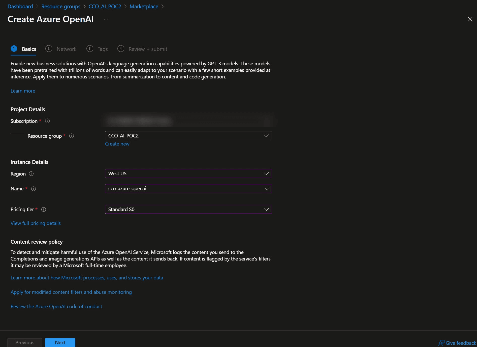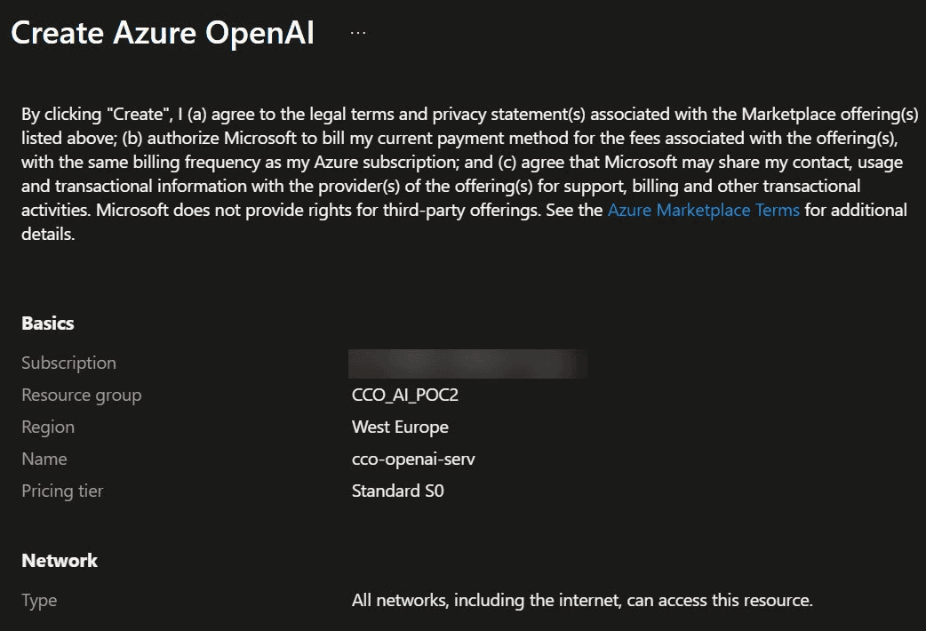 Étape 1 : créer un service Azure OpenAi depuis le portail Azure > rechercher la création de la ressource Azure OpenAI
