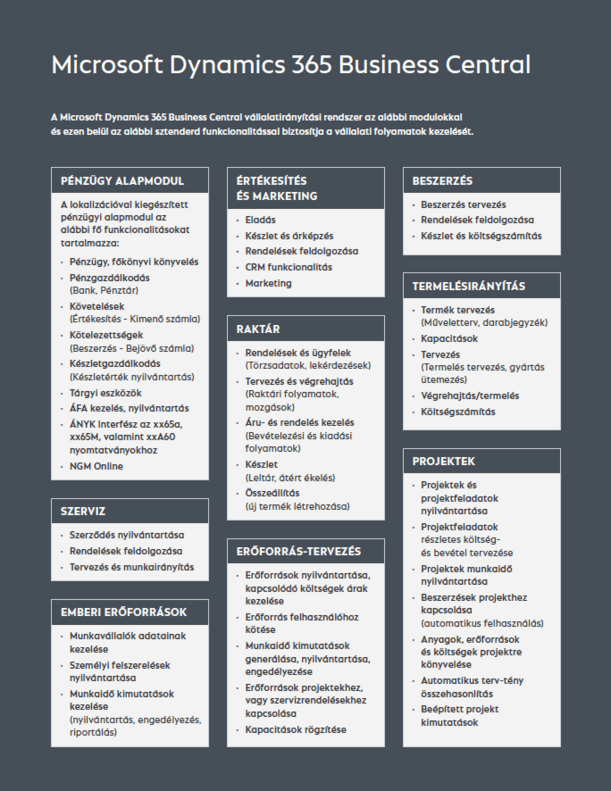 A Microsoft a kis- és középvállalatoknak szóló ERP megoldását a Dynamics NAV-ot felhő alapokra helyezte, és a Dynamics 365 család legfrissebb tagjaként Business Central néven vezeti be a magyar piacra. Ha új ERP rendszer bevezetésén gondolkozik, érdemes felírni a listájára a Business Central-t! Mi pedig, hogy segítsünk a választásban az alábbi dokumentumban részletesen összegyűjtöttünk minden funkciót, amik naggyá teszik a Business Centralt!