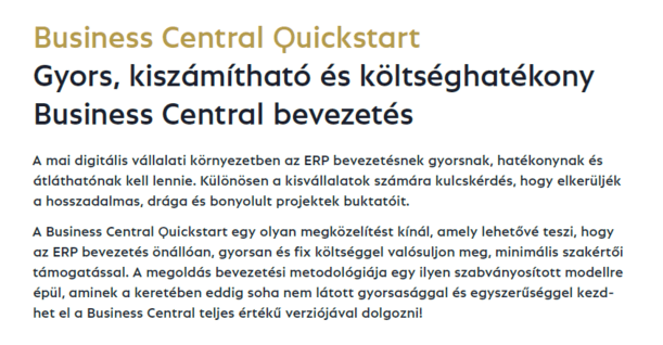 Az alábbi dokumentum bemutatja, hogyan forradalmasítja a Business Central QuickStart az ERP-bevezetést: gyors, fix díjas, modulárisan bővíthető megoldás, amely ideális a KKV-k számára. A megoldás előre konfigurált, azonnal használható, beépített digitális tanácsadóval támogatott és szakértői támogatás csak akkor szükséges, ha Ön igényli.