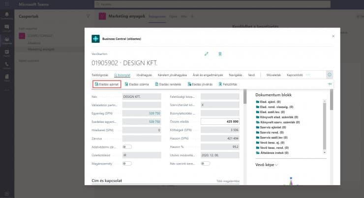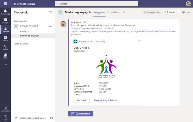 A Teams beszélgetésekbe beillesztett Business Central linkek automatikusan intelligens adatlapokként jelennek meg, amelyről könnyen elérhetőek a Business Central funkciók: