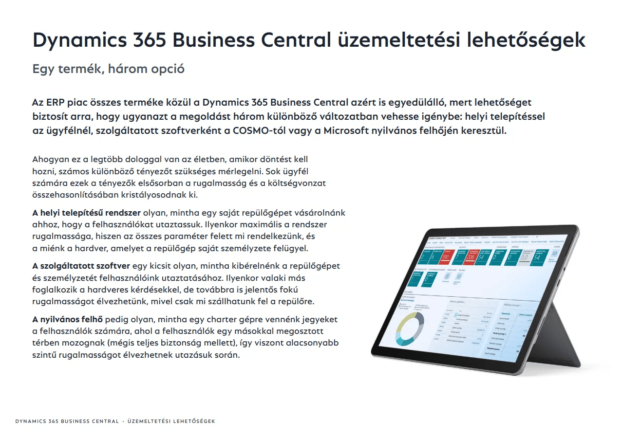 Az ERP piac összes terméke közül a Dynamics 365 Business Central azért is egyedülálló, mert lehetőséget biztosít arra, hogy ugyanazt a megoldást három különböző változatban vehesse igénybe: helyi telepítéssel az ügyfélnél, szolgáltatott szoftverként a COSMO-tól vagy a Microsoft nyilvános felhőjén keresztül.